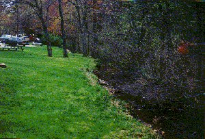 Another pond area is present further downstream. This is followed by an area where the stream flows past lawns that run to the waters' edge, with no buffer area to filter out fertilizers, pesticides etc. A little further on is an area where a man-made dam causes the stream to form a pool, that is approximately twelve feet wide and one foot deep. The bottom consists of mud and leaves, and the water is clear. The furthest downstream portion of NBWL2 is about six inches deep, with